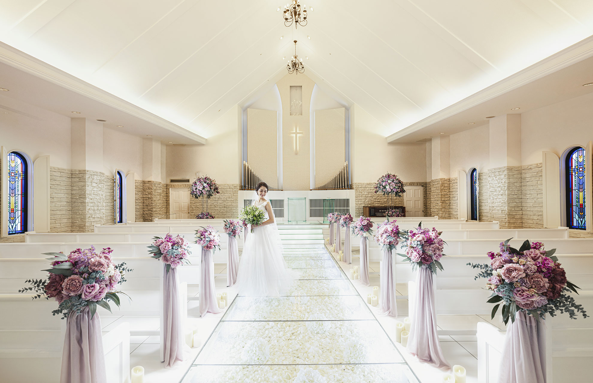 大きな扉を開けば、美しく煌めく純白の世界が広がります。季節の花々が敷き詰められたガラスのバージンロードが花嫁の可憐さを惹き立て、感動と喜びのセレモニーが実現します。
