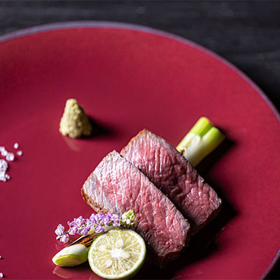 - お肉はさばきたてでなく、寝かせるとより美味しさが引き立ちます。1週間前に肉のすじや脂身をそうじし、うまみ(脂が均等にあり肉の甘味がある霜降り部分)を凝縮。一週間じっくりと寝かせたものを焼き上げてお出ししております。