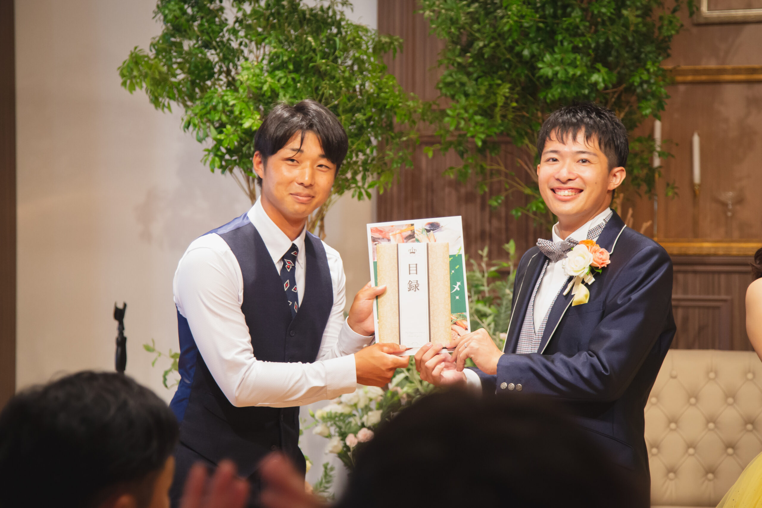おふたりが生まれた日から結婚式までの日数が刻まれた時計のプレゼントをお渡しされました
