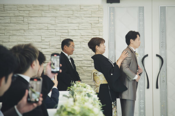 新郎様はお母様からジャケットを着せてもらい、