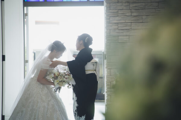 新婦様はお母様からのベールダウンを受け、