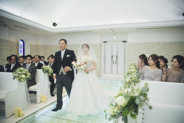 お父様と手を取り合ってゆっくりとバージンロードへ。