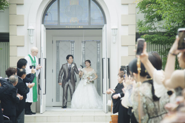 退場後のフラワーシャワーでは、 青空の下、