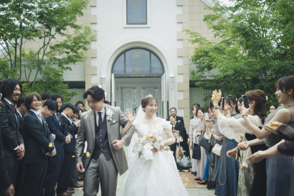 ゲストの笑顔と花びらに包まれながら、 幸せいっぱいのおふたり。